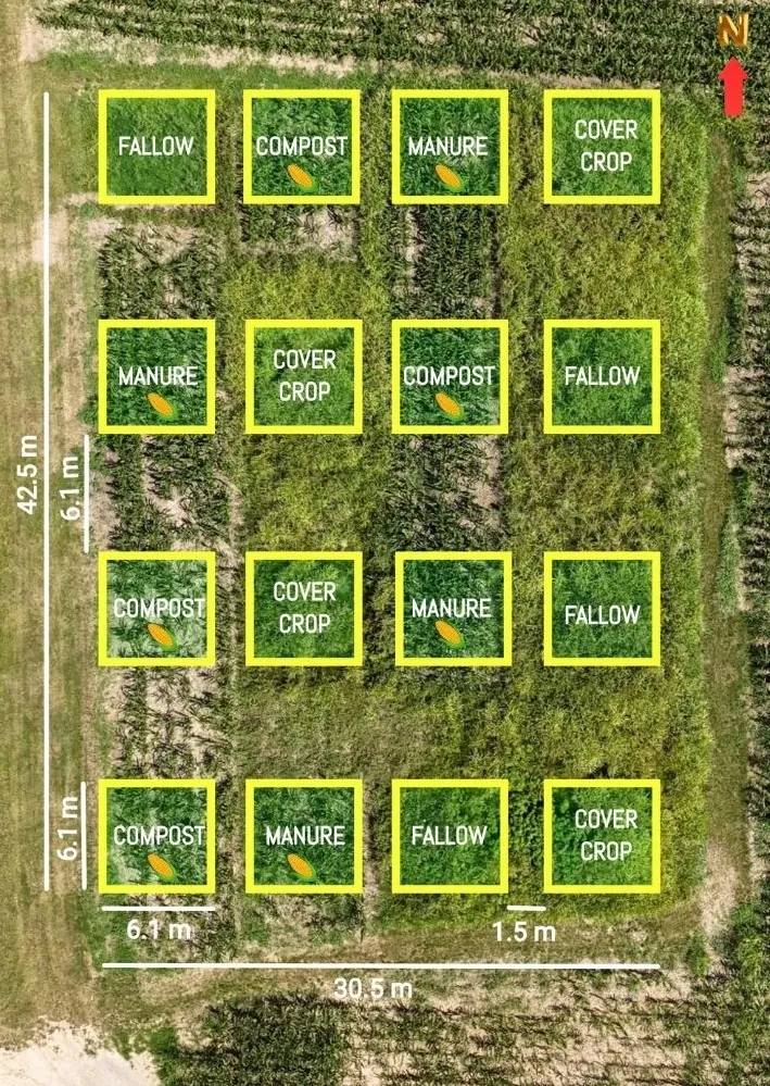 The plots are located on Crosby silt loam, a fine, mixed, mesic Aeric Ochraqualf typical of Ohio’s glacial till plains. The soil is moderately drained and highly responsive to management, making it ideal for long-term experiments on soil physical quality and nutrient cycling. The experiment spans a 42.5 m × 30.5 m field, arranged in a randomized complete block design (RCBD) with four treatments — fallow, cover crop, compost, and manure — replicated four times.